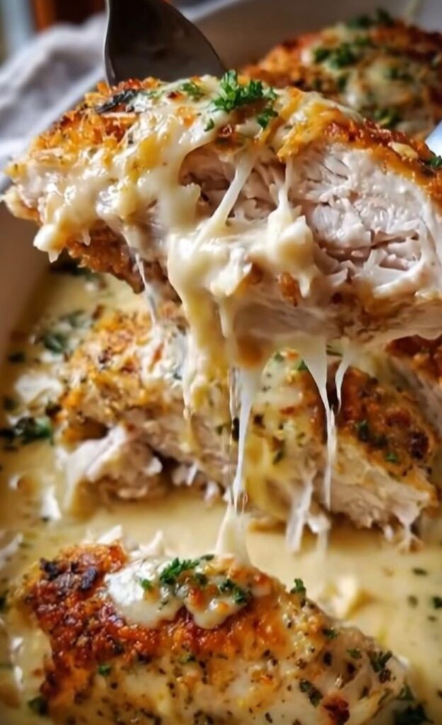 - Assemble • Pour the creamy Parmesan sauce over the baked chicken • Garnish with parsley and extra cheese